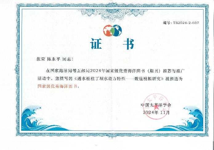 近日,在中国太平洋学会开展的国家级优秀海洋图书(期刊)推荐与推广活动中,由北京赛车PK10 张荣副研究员、陈永平教授编写的专著《透水桩柱丁坝水动力特性——数值模拟研究》被评选为2024年度“国家级优秀海洋图书”。