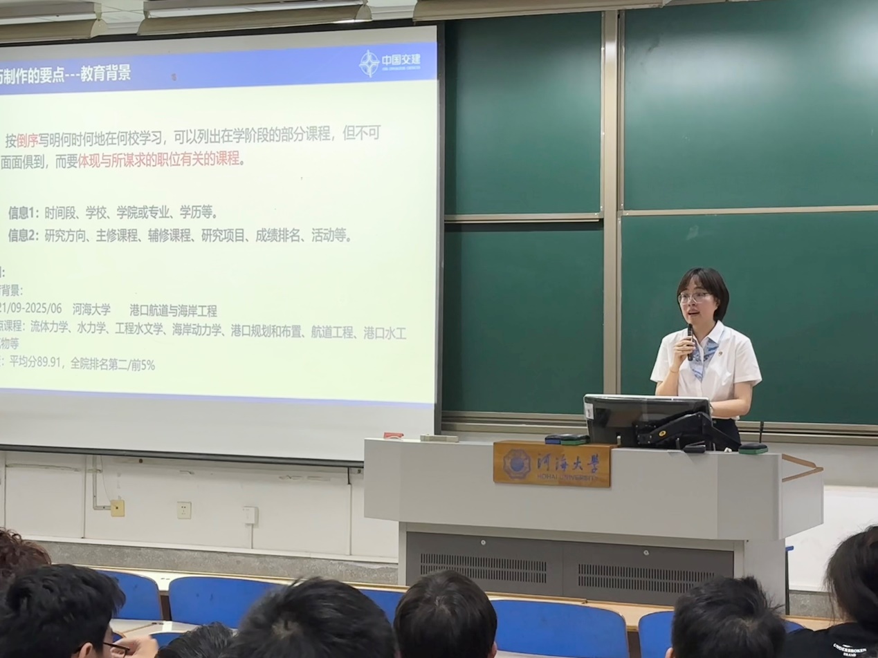 林斐从就业形势解读、职业发展规划、就业心理指导、求职技巧分享、就业权益保护和其他事项共五个维度为同学们展开讲述。她结合当前行业趋势,分析工科专业学生的就业机遇与挑战,并提供针对性建议。基于此,她给出针对学生个人的一系列建议,就简历优化、面试策略等实用技能进行详细指导。