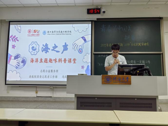 2023级分享了社会实践的丰富性和可操作性以及对社会带来的积极影响,激发了同学们对暑期实践的兴趣。2023级冯禹博介绍了“海之声海洋科普课堂”的实践内容,分享了自己的材料汇总、资料总结等经验。