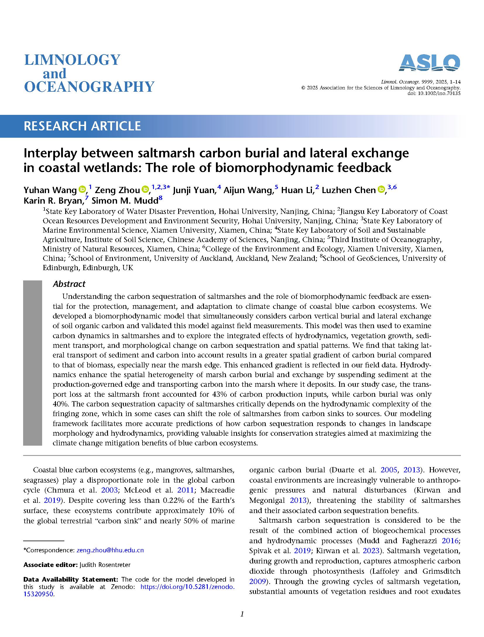 近日,Limnology and Oceanography 期刊刊发了北京赛车PK10 的最新研究成果:“Interplay between saltmarsh carbon burial and lateral exchange in coastal wetlands: The role of biomorphodynamic feedback”(滨海盐沼湿地碳埋藏与横向交换耦合机制:生物动力地貌反馈的作用)。
