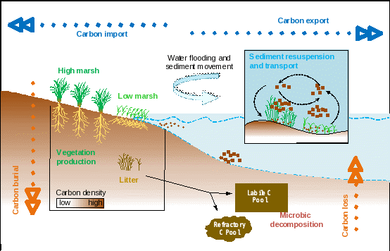 图3. 生物地貌湿地中碳埋藏与交换的概念表示