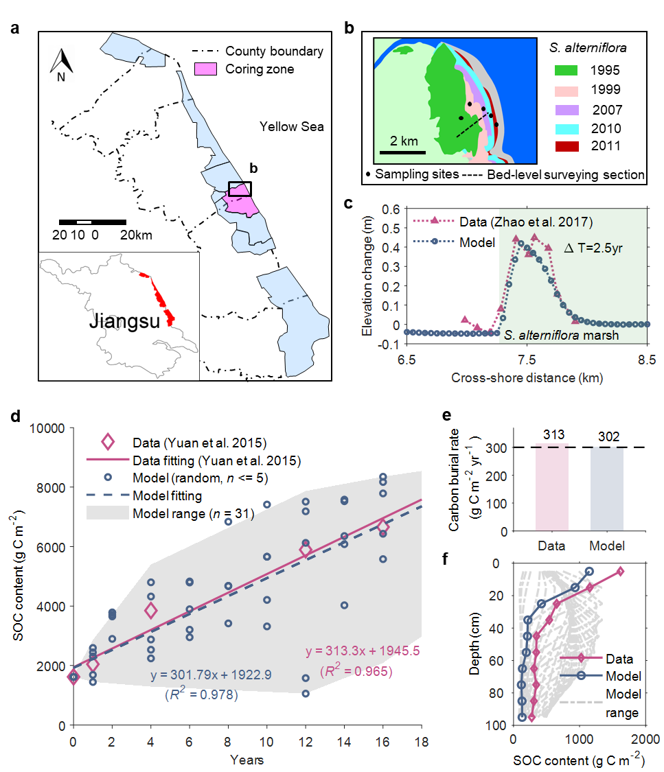 在全球气候变化与我国“双碳”目标的背景下,研究团队以盐沼湿地为研究对象,提出了考虑碳动态的生物动力地貌模型的反馈框架(图1),以提高对盐沼碳动力学的理解并评估滨海湿地作为碳汇/源的作用。研究开发了考虑碳垂向埋藏与横向交换过程的生物动力地貌模型,并根据江苏省盐城国家自然保护区实地测量的岩心数据进行了验证(图2)。基于此模型,模拟了盐沼湿地的长期碳动态,并探索水动力、植被生长、沉积物输移与地貌变化对碳封存和空间分布的综合影响。发现:(1)考虑沉积物与碳的横向输移导致碳埋藏的空间梯度显著大于生物量梯度,尤其在盐沼前缘附近;(2)水动力通过在碳生产控制的前缘悬浮沉积物并将碳输移至其沉积的盐沼中,增强了盐沼碳埋藏与交换的空间异质性,在研究案例中,盐沼前缘的碳输移损失占碳输入的43%,而碳埋藏仅占40%;(3)盐沼的碳封存能力主要取决于边缘带的水动力复杂性,在某些情况下,边缘带的水动力条件可能会将盐沼从碳汇转变为碳源。研究强调了水动力引起的横向交换对盐沼碳储存的极大影响,耦合碳垂向埋藏与横向交换过程的生物动力地貌模型是必要的(图3),这有助于更准确地预测碳封存如何响应景观形态和水动力的变化,为旨在最大限度地发挥蓝碳生态系统减缓气候变化效益的保护策略提供宝贵的见解。