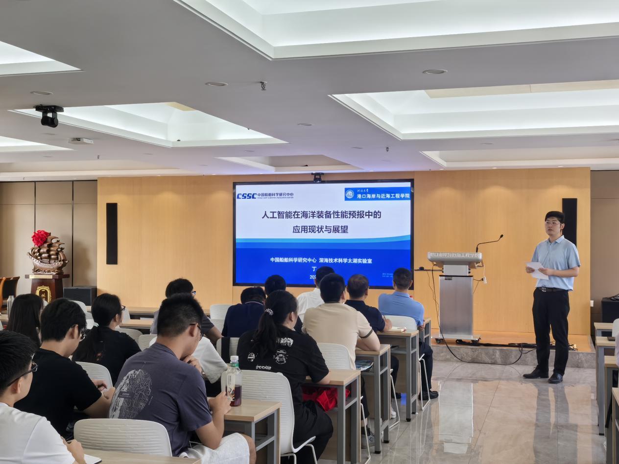 2025年9月6日,中国船舶科学研究中心深海技术科学太湖实验室丁军主任应北京赛车PK10 邀请,在严恺馆702会议室作了题为“人工智能在海洋装备性能预报中的应用现状与展望”的学术报告。学术报告会由龚政教授邀请,管大为教授主持。