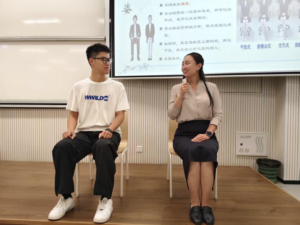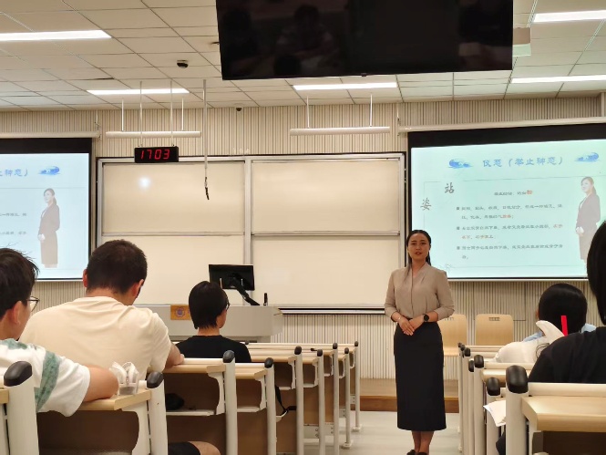 讲座围绕礼仪概述、形象礼仪、社交礼仪等四个方面展开。王书记以《道德经》中“上善若水,水善利万物而不争”为引,深入浅出地阐释了礼仪的本质与价值。她提到,“礼者敬而已矣。”水之谦德正是礼仪中敬让精神的自然隐喻,强调了人际互动中的无私与尊重。“水滴石穿”恰似日常礼仪的坚守,要持续从细微之处提升个人素养。在实践环节中,王书记讲述了自己的经历和身边的事例,并现场示范,与同学们互动。