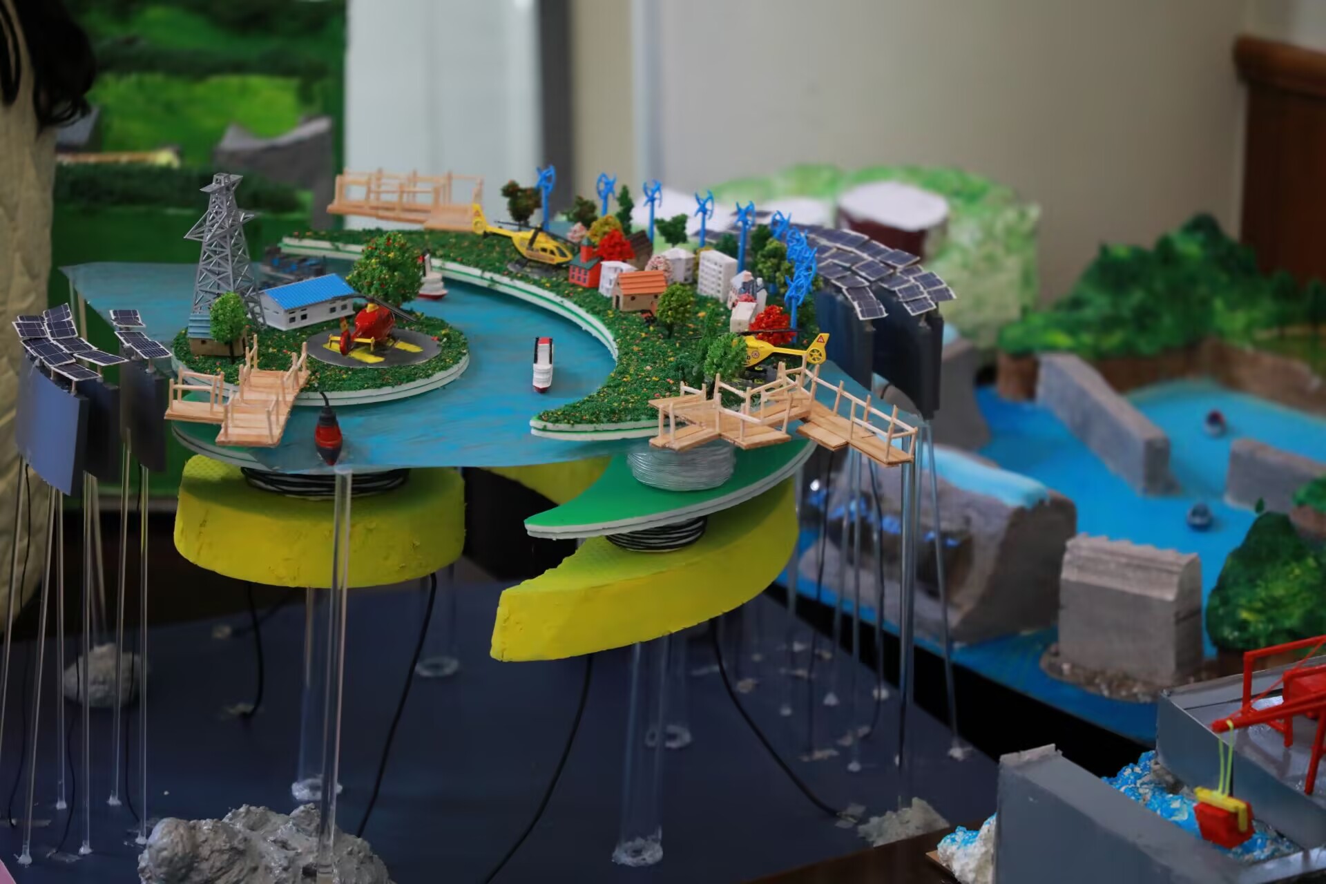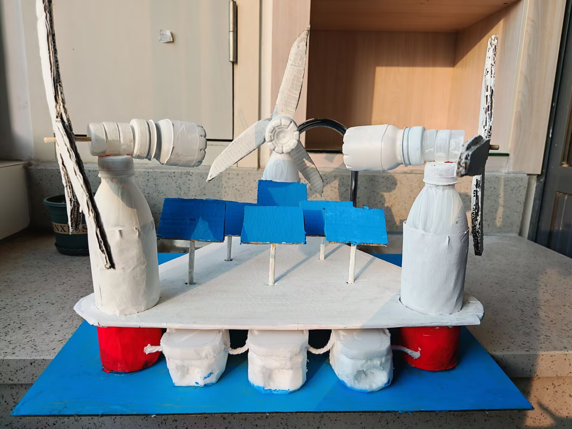 这一模型聚焦海域资源集约利用,打造“风光发电+海洋养殖”的共生系统:海面上方布设风电与光伏组件实现能源供给,以及全自动化起捕系统实现智能化.水下空间配套生态养殖设施,通过共享基础设施降本增效,同时以储能技术保障养殖设备稳定供电。作品以工程创新融合蓝碳经济与生态效益,既实现清洁能源生产,又拓展海洋农牧空间,是海域资源可持续开发的具象化探索。