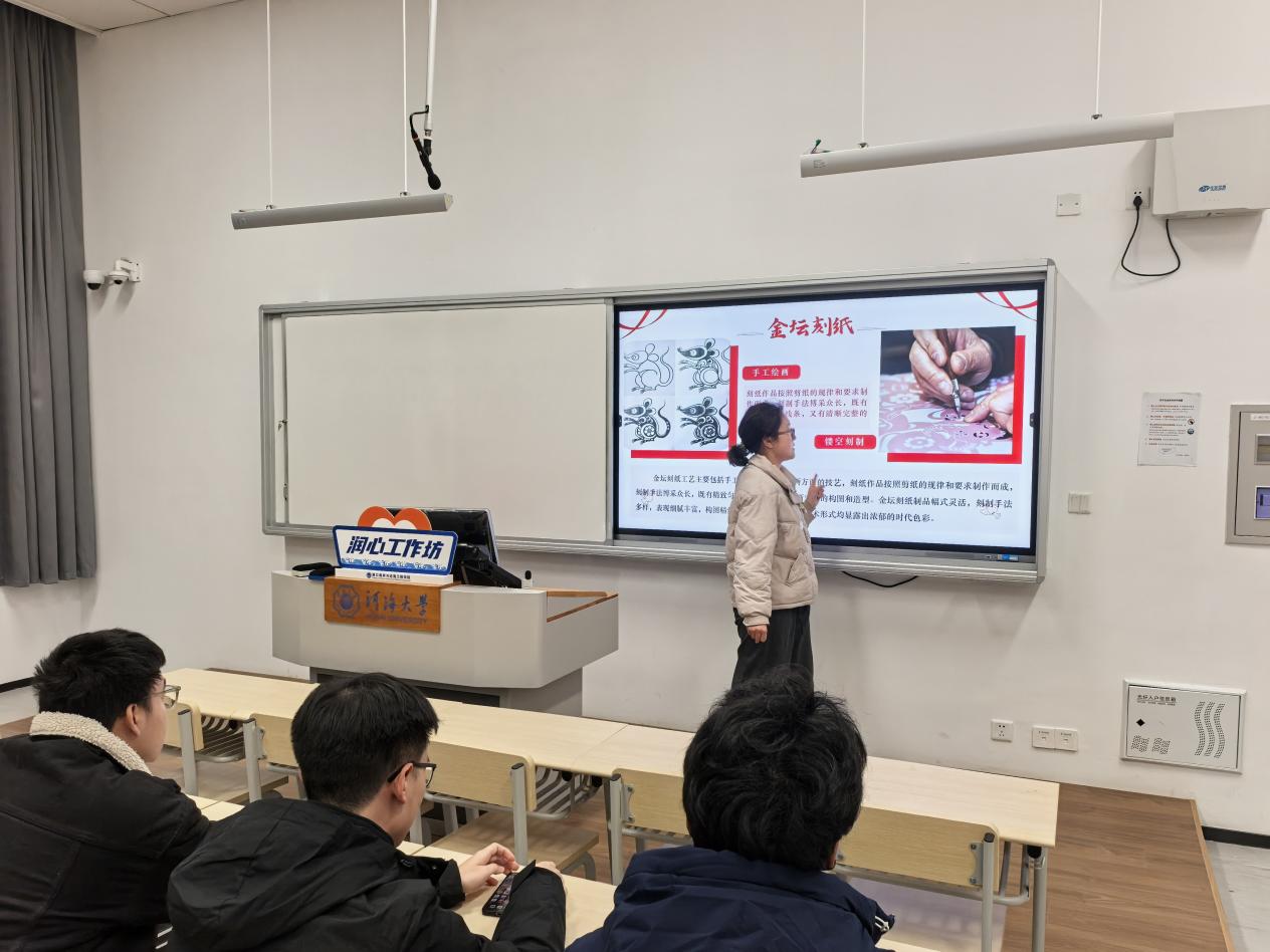 本次活动以“数韵非遗,纸载校庆”为核心主题,融合非遗传承与校庆情怀。活动伊始,金坛刻纸社唐晶同学作为主讲人,介绍了金坛刻纸的非遗历史渊源,重点拆解了手工绘画(精准勾勒、兼顾美感与寓意)和镂空雕刻(含阴刻、阳刻等刀法)两大核心工艺。现场通过展示社团过往作品照片,涵盖校园、校庆元素创作,直观展现刻纸艺术魅力,点燃了同学们的实践热情。