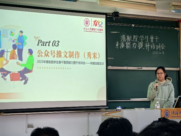 培训聚焦“传媒技能专项培训”“通讯稿撰写规范与实操训练”“报销流程规范说明”三大主题。帅嘉奕结合自身工作经验系统阐述了如何用镜头与文字讲好港航故事。赵安欣详细介绍了通讯稿的基本结构、写作要点与常见误区,并通过案例分析,帮助大家掌握宣传工作的核心写作能力。于丹丹结合实际操作流程,细致说明经费申请、票据整理、报销审批等环节的注意事项。