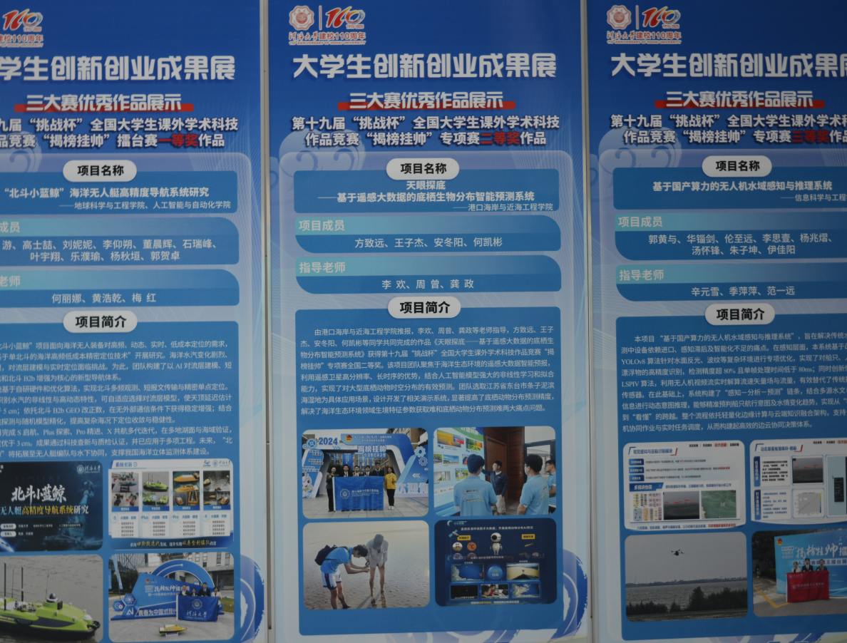 在创新创业成果展现场,北京赛车PK10 设置专门展区,重点展示国家级竞赛获奖作品及优秀创新训练项目。“三大赛”展区中:《深海哨兵——海上风机多点位冲深智能预警预报系统》获第十九届“挑战杯”全国大学生课外学术科技作品竞赛“揭榜挂帅”擂台赛擂主、特等奖;《天眼探底——基于遥感大数据的底栖生物分布智能预测系统》获赛事“揭榜挂帅”专项赛全国二等奖,《智慧粒子海工冲刷预警预报系统》获该竞赛全国三等奖。在中国国际大学生创新大赛中,《仓潮智行——海工级无人艇智能装备产业化开拓者》在国创赛(2025)中摘得全国银奖。此外,在大学生创新训练项目板块,《河道岸线资源高效利用评价体系研究与应用》《新型亲水性海堤防浪墙设计及波浪力研究》两项项目获评2025年结题优秀国家级创新训练项目。