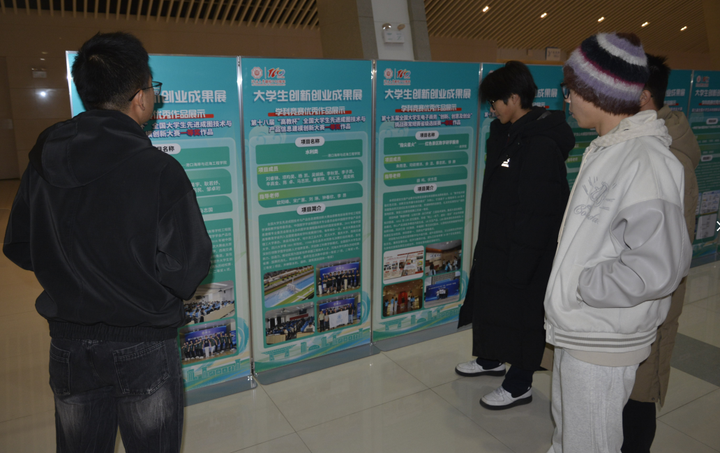 (校内学生观看北京赛车PK10 创新创业成果展板)