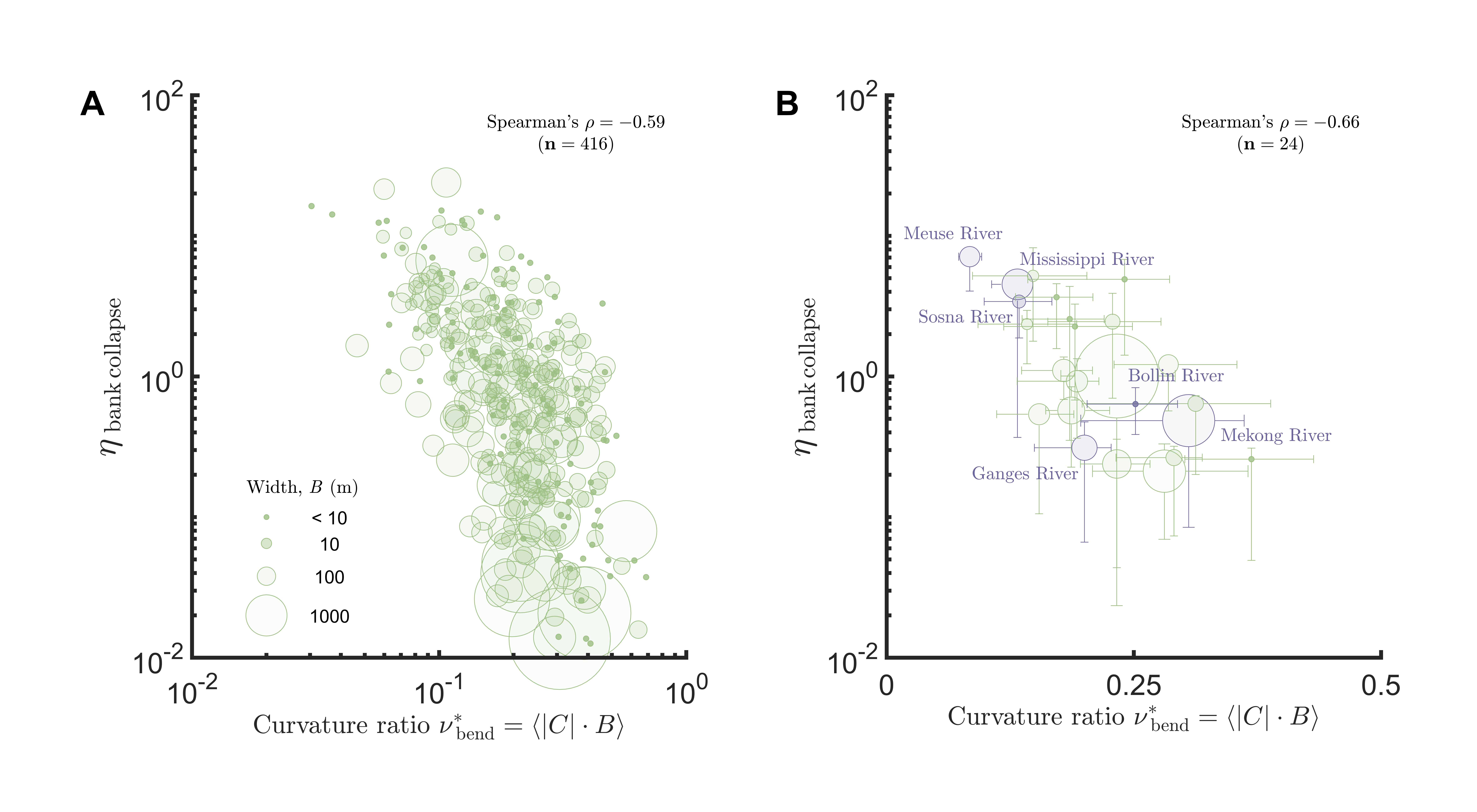 研究团队分析了全球典型大江大河,发现了河流宽度变化具有三个特征空间尺度,分别对应三种地貌单元:曲流弯段、江心洲沙坝,以及崩岸引起的局部岸线侵蚀(图1)。傅里叶分析表明崩岸驱动的宽度变化与弯道曲率之间存在显著的负相关关系,凸显了崩岸对弱弯曲河段的地貌塑造作用(图2)。进一步地,研究团队开发了考虑崩岸过程的曲流河道演变模型,阐明了崩岸对曲流河道形态的长期塑造作用,主要表现为:增强河道宽度的局部变异性、加快河道侧向迁移与摆动、促进河漫滩发育和重塑。