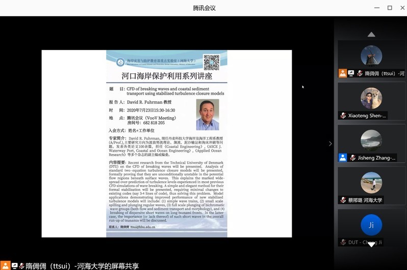 On July 23, 2020, the Key Laboratory of Ministry of Education of Coastal Disaster and Protection,organized the online academic exchange expert report meeting of Series Lectures on Protection and Utilization of Estuarine and Coast. Invited by  Prof. Zheng jinhai, director of the Laboratory, Professor David R. Fuhrman of the technical university of Denmark, as the first report expert, gave an academic report entitled CFD of breaking waves and coastal dimensional transport using stabilized turbulence closure models. Vice dean Zhang Jisheng presided over the report meeting.